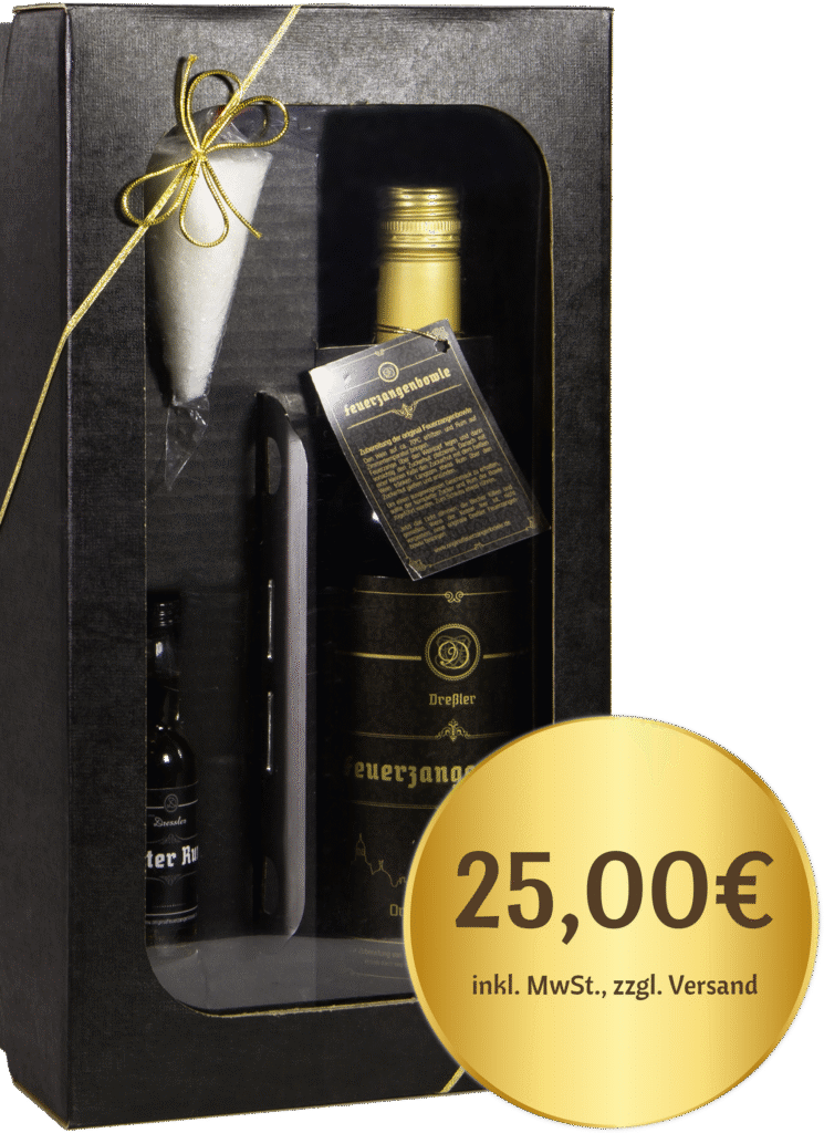 Inhalt: 1 Liter Feuerzangenbowle 10% Vol., 4cl echter Überseerum 54% Vol., Zuckerhut und Feuerzange