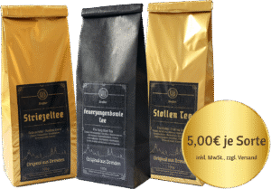 Stollen Tee: Apfelstücke, Hibiskus, Hagebuttenschalen, Orangenschalen, Mandelstücke, Marzipanstücke, Rosenblütenblätter, Vanillestücke, Zitronengranulat, Aromen